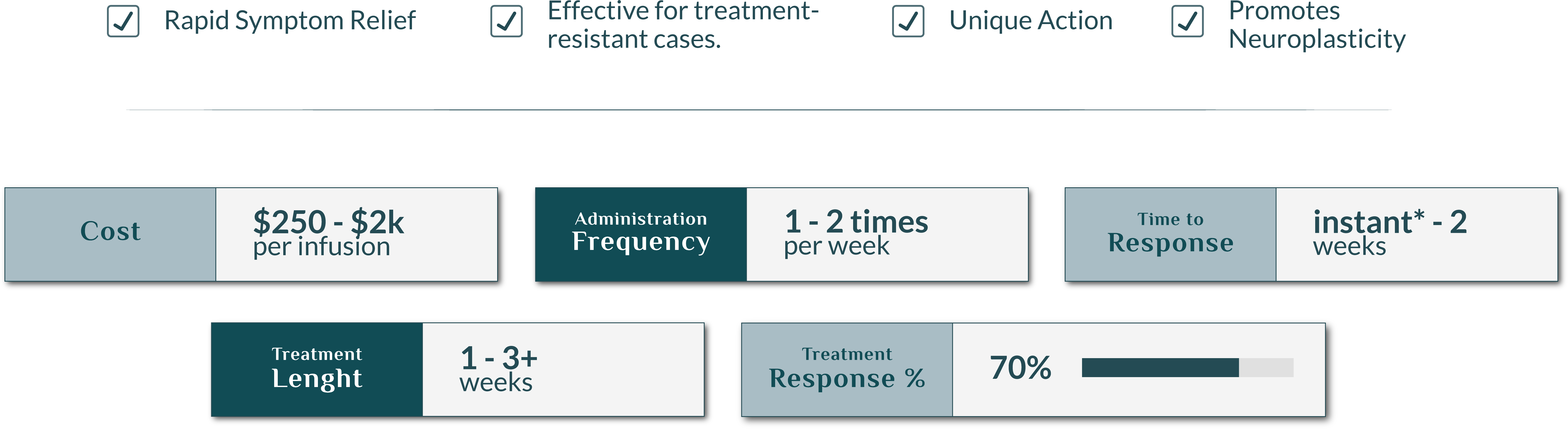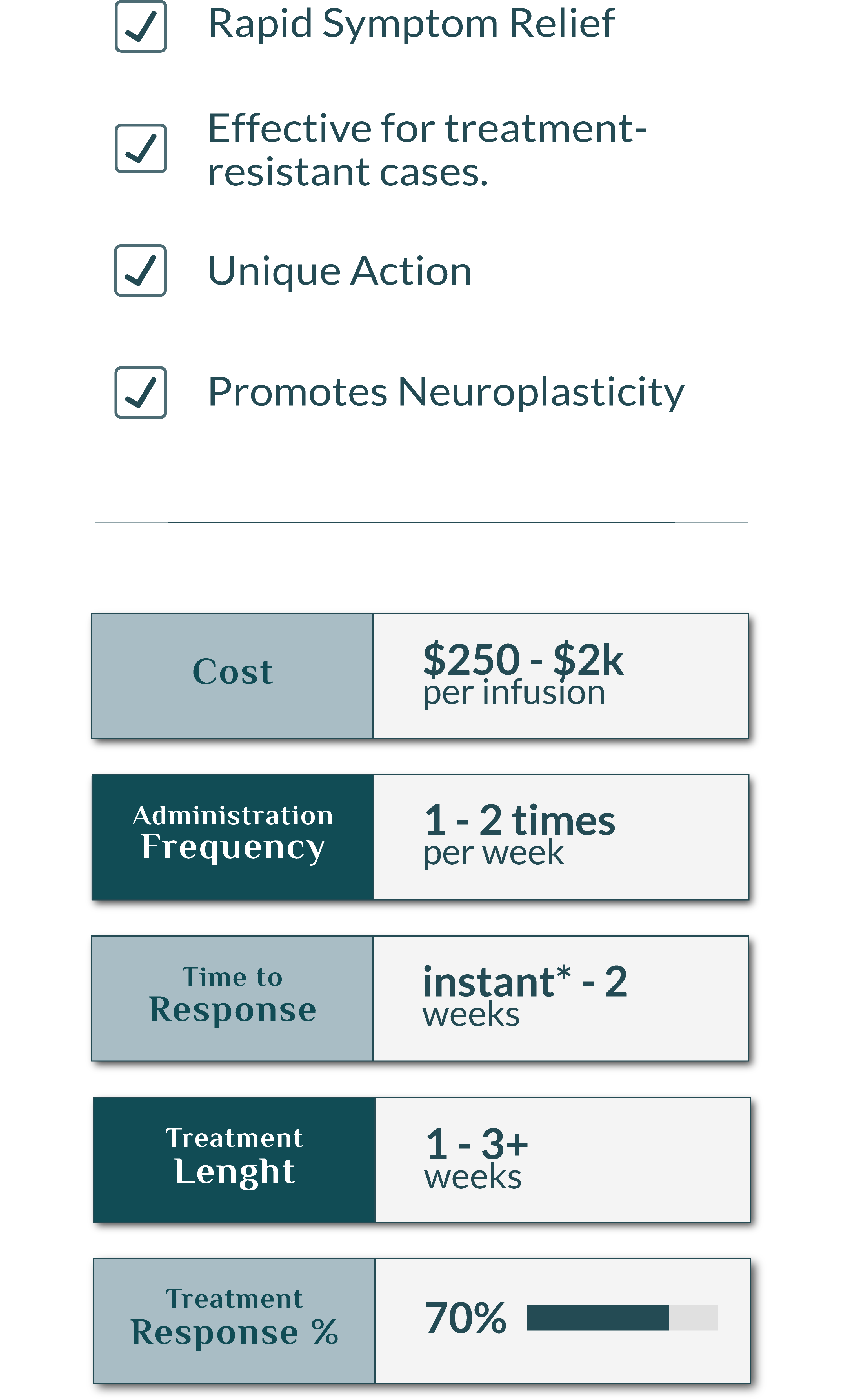 Ketamine’s effectiveness varies and depends on several factors, such as a patient’s medical history and condition severity. However, clinical studies show that around 50-70% of individuals with depression experience significant relief following ketamine therapy.